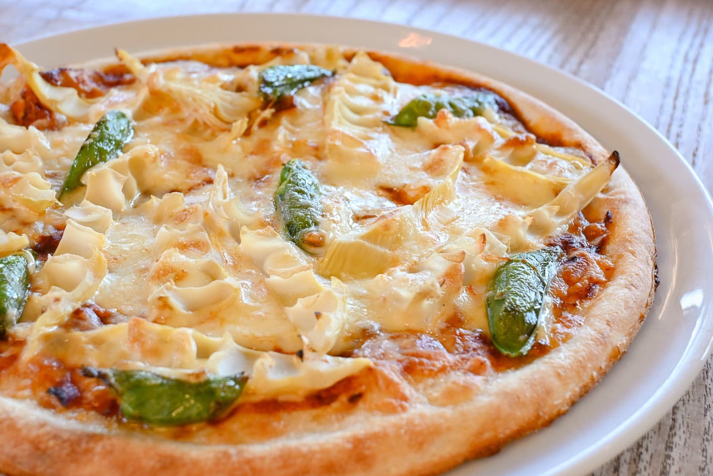 茹でずに皮つきのまま丸ごとじっくり焼いた筍は極上に風味豊か。焼き筍、柚子胡椒を和えた塩麹チキンとアスパラをトッピングした春のピザです。